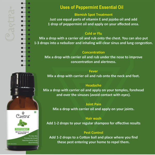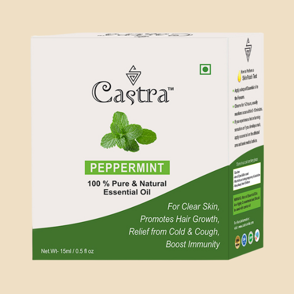 Cool Relief, Pure Energy Experience the powerful, cooling rush of Castra Peppermint Essential Oil. Distilled from the fragrant leaves of the peppermint plant, this 100% pure and natural oil is a staple for natural wellness. Its key benefits include promoting Hair Growth, providing Relief from Cold & Cough, and helping to Boost Immunity. Keep it on hand to clear your sinuses, soothe pain, and sharpen your focus.